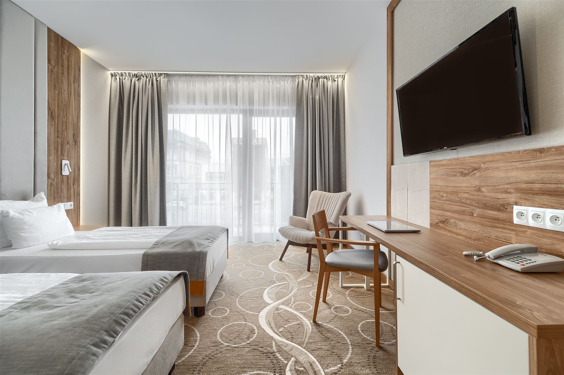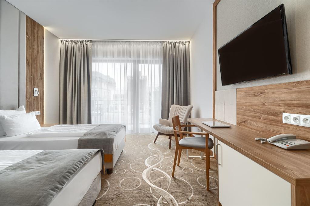 Das Hotel verfügt über Rezeption, Lobby, Restaurant, Speiseraum, ein Dachcafé mit Meerblick (ab September), großes Schwimmbad, Whirlpool und Saunen. Jedes Gebäude verfügt über einen Lift. Die Zimmer sind modern und luxuriös auf 24m2 eingerichtet: mit Kühlschrank, TV, Telefon, Zimmertresor sowie Balkon und Bad mit Dusche/WC und Fön.
